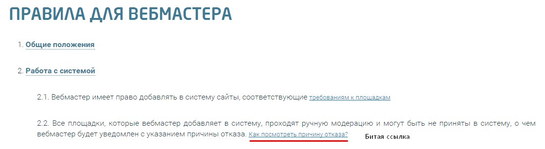 За внутренними ссылками, даже в таком важном разделе как «Правила системы» http://www.miralinks.ru/rules , тоже особо не следят.