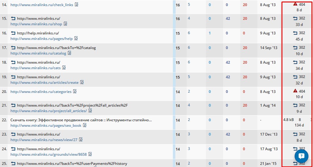 Кроме того, есть прокачанные страницы с большим количеством входящих ссылок, но которые, отдают 404 ошибку.